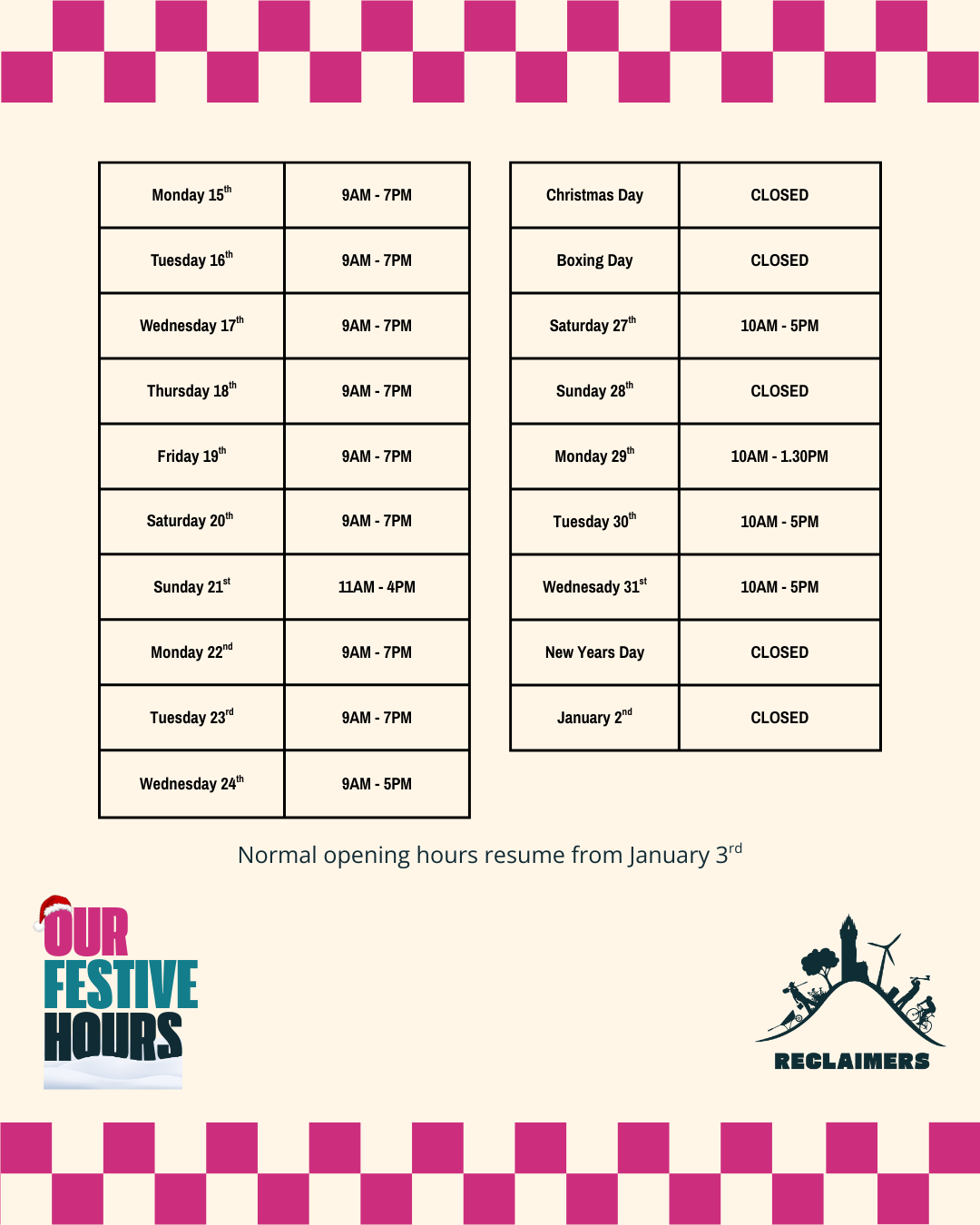 Reclaimers is closed Christmas Day, Boxing Day, New Years Day and the 2nd January. Normal opening hours resume on 3 January 2026. See below for full festive opening hours
